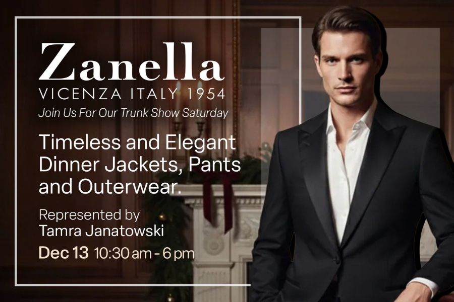 Meet brand representative Tamra Janatowski and explore a curated selection of men’s dinner jackets, pants, and outerwear. Each piece is designed with timeless style and exceptional quality, perfect for elevating your holiday wardrobe.